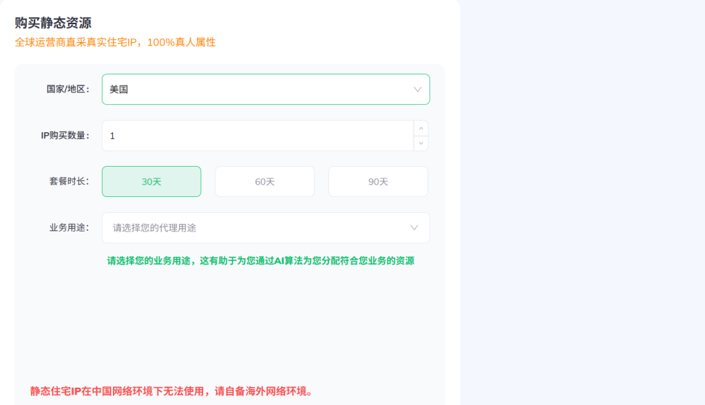 选择像IPdood这类专业提供美国住宅IP的服务商。打开IPdodo官网,注册并登录用户后台,在静态/动态住宅IP产品栏中,直接下单,即可提取目标国家的IP地址、端口及认证信息。