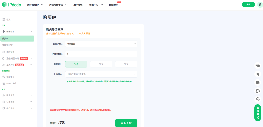 作为拥有马来西亚本地家庭宽带资源的服务商,IPdodo的住宅IP在稳定性、纯净度、独享程度与售后能力上表现突出。因此,无论是做马来西亚电商、广告投放、社媒本地化运营,还是远程办公与本地服务访问,IPdodo 都能提供更稳定、更安全、更适合长期业务的马来西亚静态住宅IP方案。