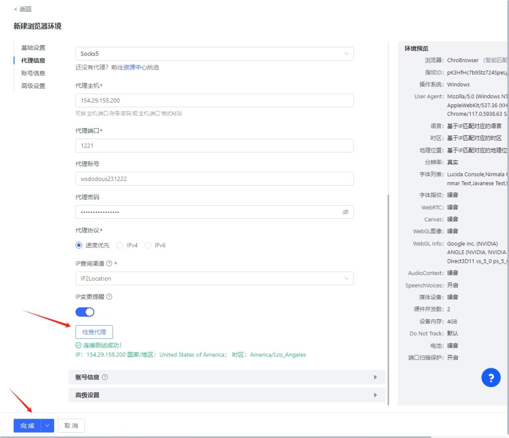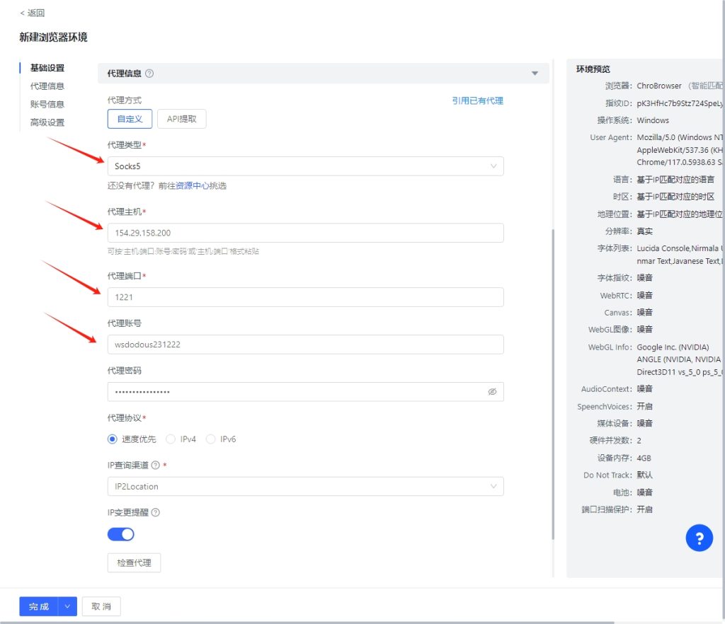 第二步,配置代理信息。假如我们获取的代理端口地址是 socks5://154.29.158.200 :1221,则分别复制 154.29.158.200 , 1221,代理类型是socks5,端口的账号:(登录IPdodo后台获取), 密码: (登录IPdodo后台获取)。复制到的IP、端口号、账号、密码等分别填入到 Hubstudio 指纹浏览器的应用当中。Hubstudio设置代理部分,信息填写如下: