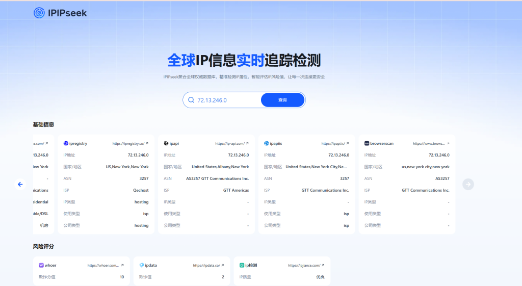 常见的网站:ipipseek.com:聚合全球权威数据库,精准检测IP属性,智能评估IP风险值。