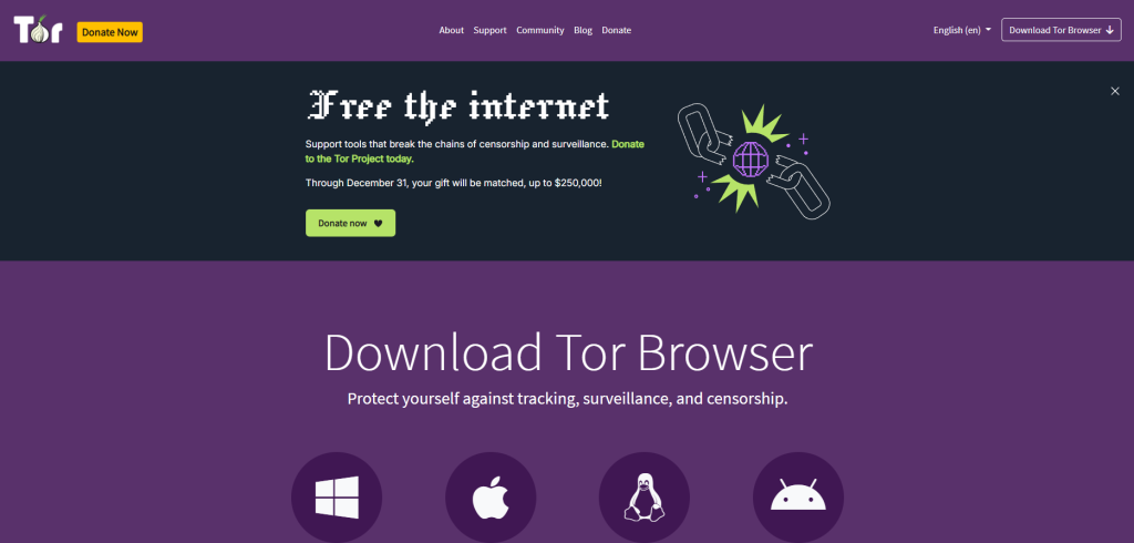 下载 Tor 浏览器最安全简单的方式,就是访问 Tor Project 官方网站。请勿从任何第三方网站下载,以防下载到被恶意修改的版本。