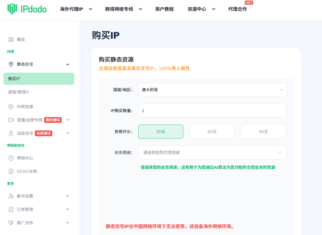 作为拥有澳洲住宅静态IP的服务商,IPdodo的住宅IP在稳定性、纯净度、独享程度与售后能力上表现突出。因此,无论是做澳洲电商、广告投放、社媒本地化运营,还是远程办公与本地服务访问,IPdodo 都能提供更稳定、更安全、更适合长期业务的澳洲住宅静态IP方案。