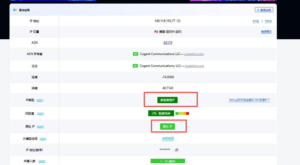 纯净 IP 仍需搭配优质网络,否则容易触发平台风控。常见的IP质量检测工具有: