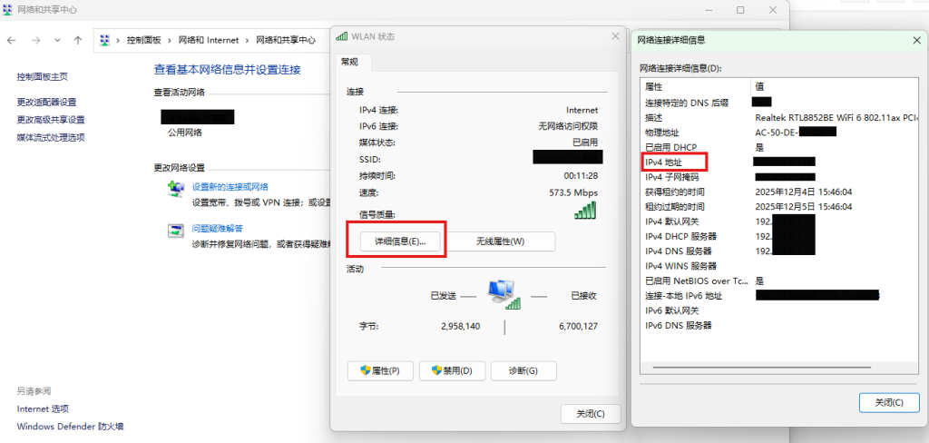 3.点击当前连接的网络,在“属性”页面中找到 IPv4 地址。