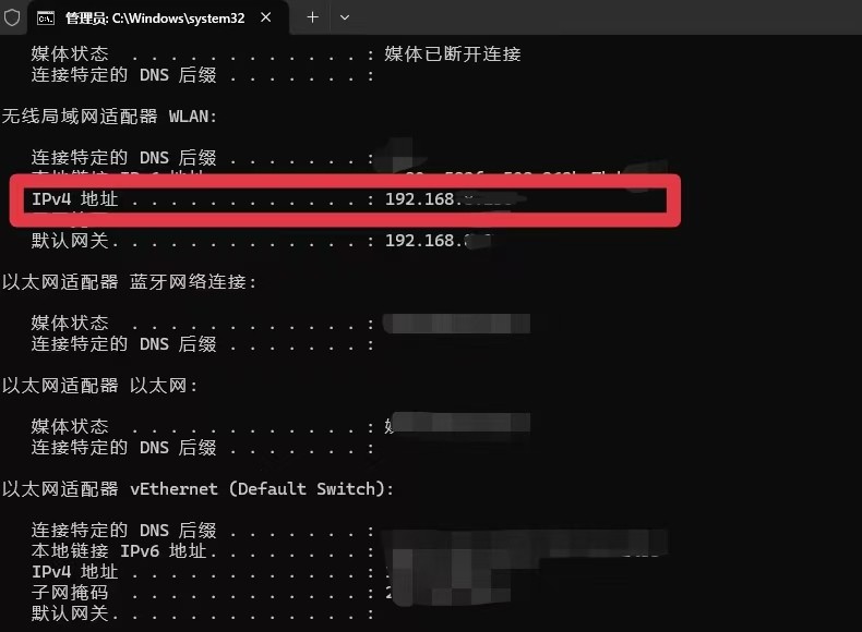 步骤:Win + R → 输入 cmd → 输入 ipconfig → 查看 “IPv4 Address”。