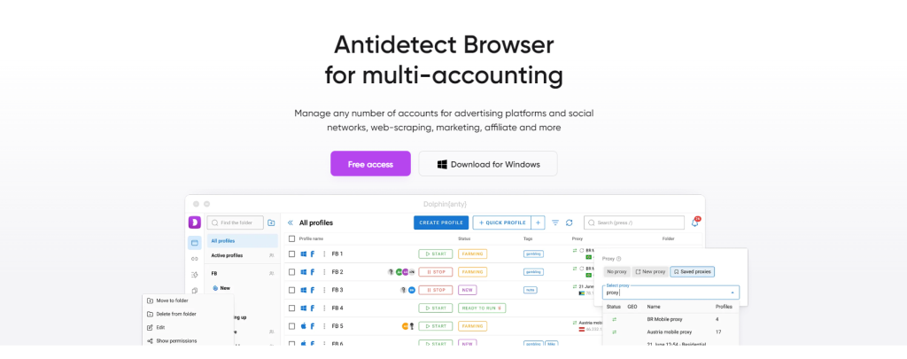 Dolphin Anty被联盟营销、加密货币交易、空投、SMM等专业人士认可为顶级指纹浏览器。 它最大的亮点是提供10个免费环境,对于预算有限的用户非常友好。 支持多环境创建和API集成,功能强大且适配性广,特别适合跨境电商和广告投放等场景。 界面设计现代,操作流程清晰,新手也能快速上手。