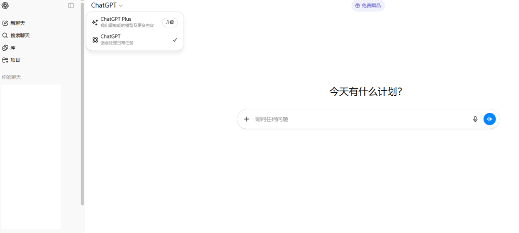 左侧是历史对话记录(History),你可以随时回顾之前的聊天内容。底部是输入框,你可以用中文直接提问。左下角是设置和升级Plus的入口。