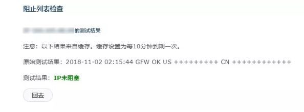 如果显示 IP BLOCKED,则可以基本确认该 IP 已在国内网络中被封锁,需要通过更换 IP 或其他方式解决。