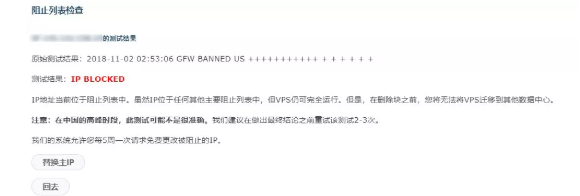 你可以通过搬瓦工官方的检测功能来确认当前的 IP 是否被封。