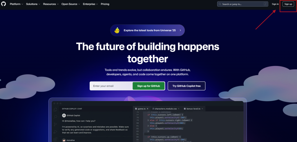 在浏览器地址栏输入 github.com。得益于我们前期的网络优化,页面应该会迅速加载。点击右上角的“Sign up”按钮。