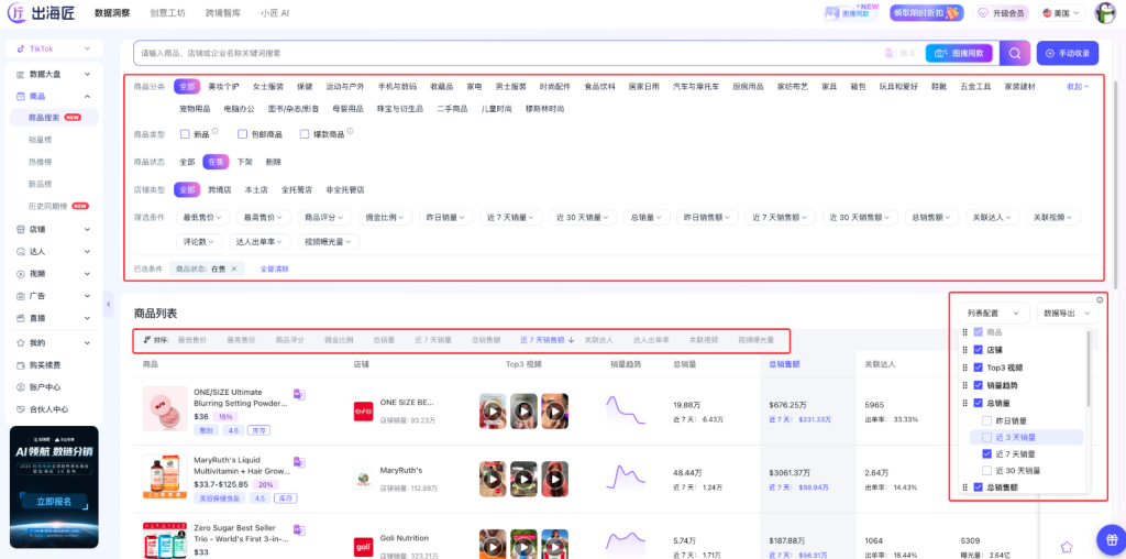 在出海匠的“商品”栏目下,可以输入关键词搜索、高级筛选、排序,筛选出感兴趣的商品。利用这些工具分析市场容量、竞品销量和关键词趋势,能提升选品成功率。