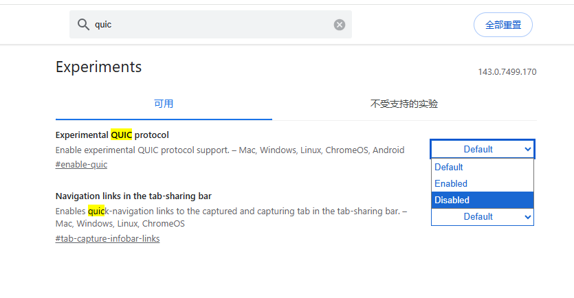 - PC端操作:在 Chrome/Edge 地址栏输入 chrome://flags,搜索 quic,将 Experimental QUIC protocol 设置为 Disabled,重启浏览器。