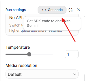 - 在中间工作区调试好提示词后,点击右上角的 “Get Code”,系统会自动生成 Python、Node.js 或 cURL 格式的初始化代码,直接复制即可使用,极大简化了开发流程。