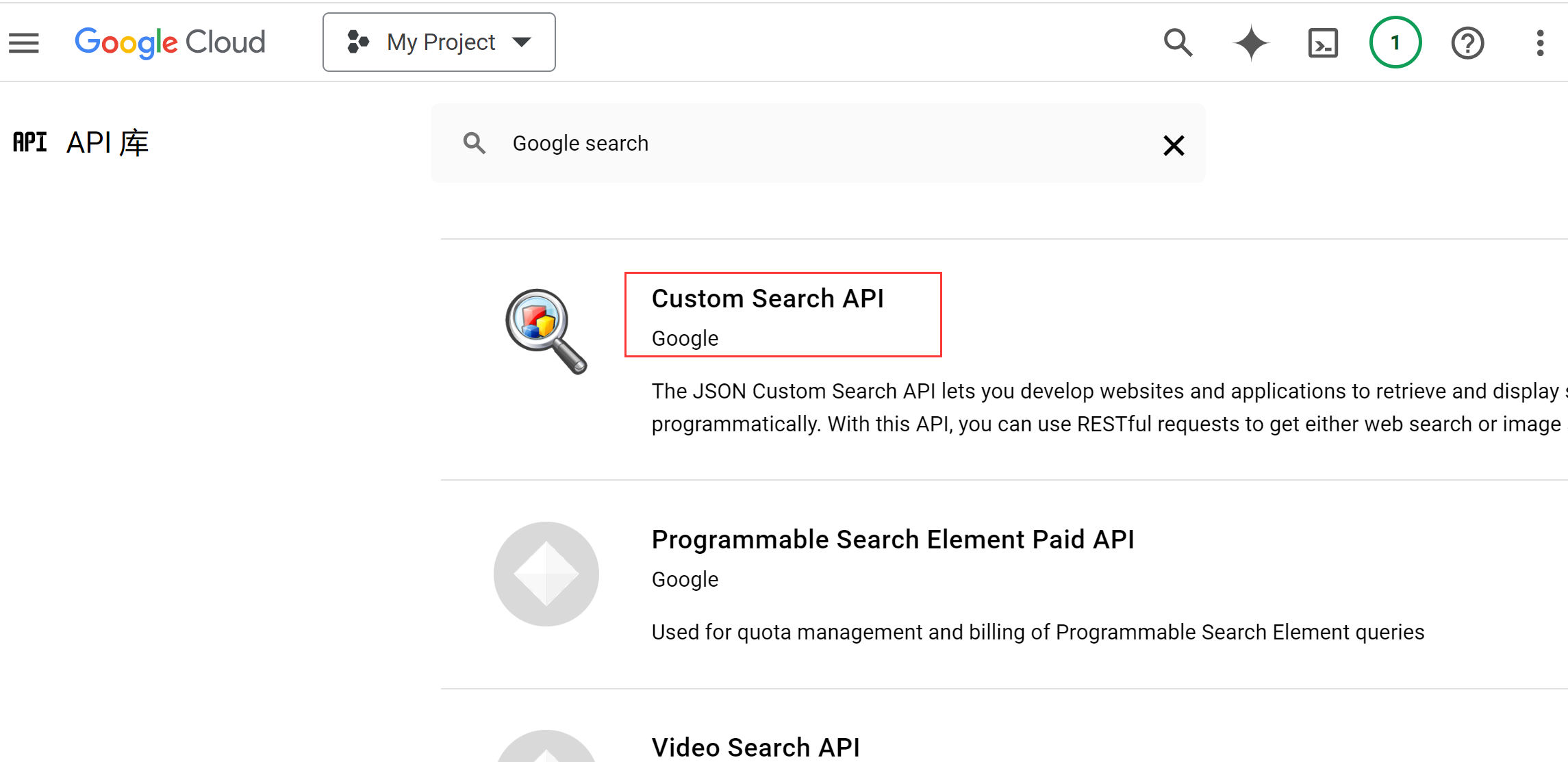 在项目仪表板中,找到“API ”>“库”。在搜索框中输入“Custom Search API”,点击进入并启用该服务。这是 谷歌搜索API 的核心功能模块。